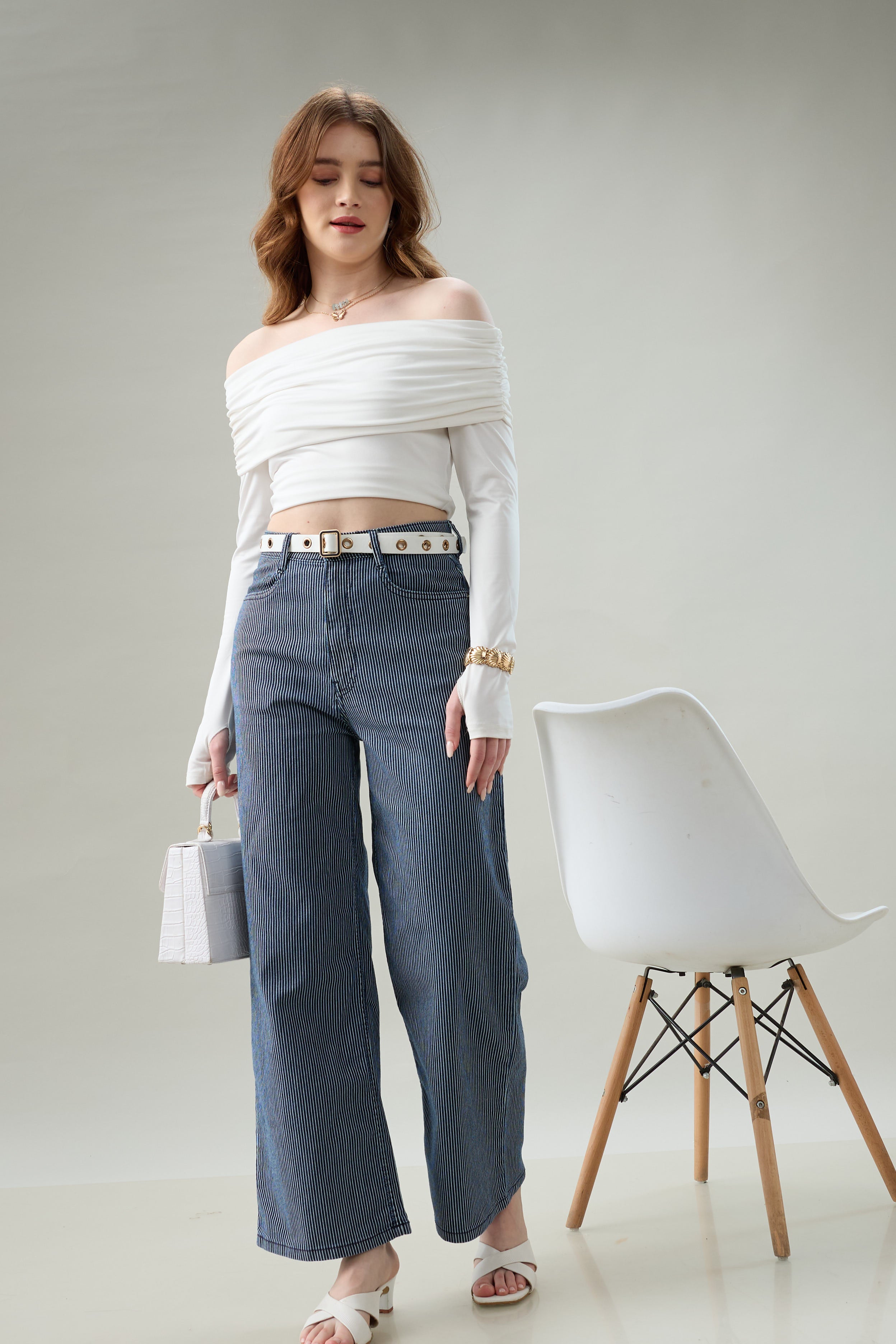Make a subtle statement with these high-rise striped wide-leg pants, designed to blend elegance with everyday comfort. Crafted from premium denim, the vertical pinstripe pattern elongates the silhouette while the relaxed wide-leg fit offers effortless movement. The high waist provides a flattering shape, making this pair perfect for both casual styling and elevated daywear. Pair it with fitted tops or flowy blouses for a polished, contemporary look.